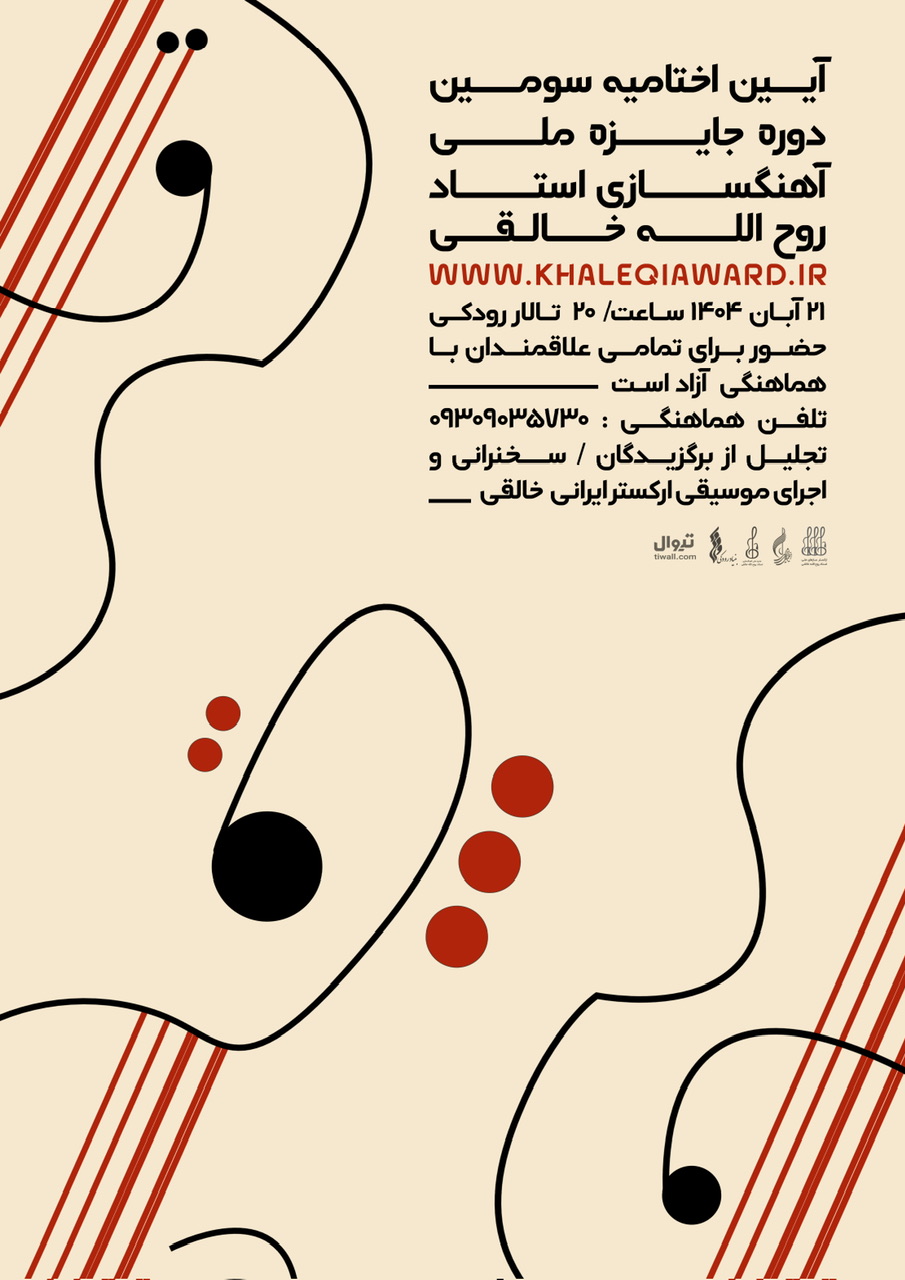 آیین اختتامیه سومین دوره «جایزه ملی آهنگسازی استاد روحالله خالقی» روز چهارشنبه ۲۱ آبانماه ۱۴۰۴ ساعت ۲۰ در تالار رودکی تهران برگزار خواهد شد.